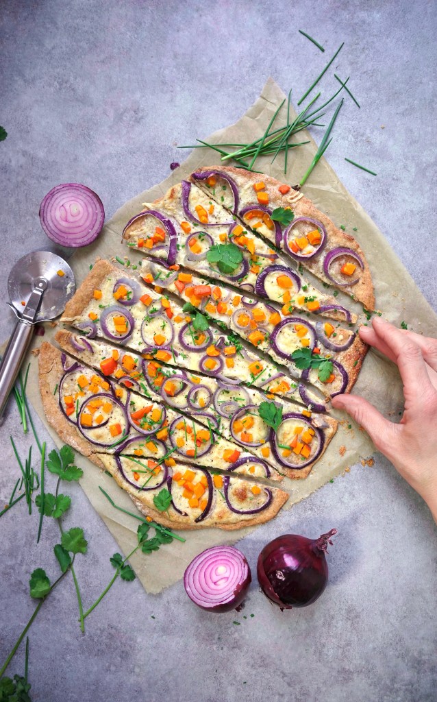 Cut the onions into rings and the hokkaido into small cubes. Mix the cashew butter with water, lemon juice and salt and pepper. Spread cashew cream on top of the base and top it with the onion rings and the hokkaido cubes. Bake for about 15-20 minutes in the oven. Sprinkle with chopped chives and basil and nutritional yeast. Enjoy!