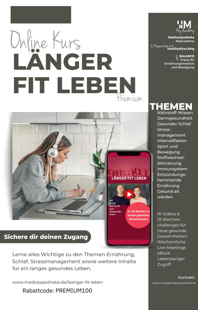 Aber aktuell gibt es für unseren Kurs „Länger fit leben“ auch noch eine Aktion (ganz unabhängig vom Conscious Bundle): Undzwar gibt es die Premium-Version mit allen Funktionen, lebenslangem Zugriff, Zugang zu den Live-Meetings, Zugriff auf alle Aufzeichnungen, Videos, Challenges, Handouts und zum eBook mit gesunden Rezepten und Zugang zur internen Community-Gruppe für 100€ anstelle von 250€. Nutzt dazu dann beim Kauf den Code PREMIUM100. Hier der Link zur Premium-Version „Länger fit leben“ für 100€ anstelle von 250€: