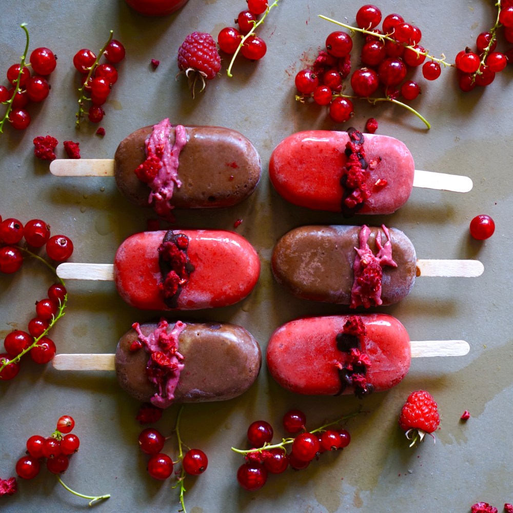 Mixe die Zutaten im Mixer und fülle sie in Eisformen. Stelle sie für mindestens 3 Stunden in den Eisschrank. Vor dem Essen am besten 10-15 Minuten bei Raumtemperatur lagern, dann sind sie aromatischer und nicht so hart. Ich habe sie noch mit geschmolzener weißer und dunkler Schokolade und getrockneten Himbeeren dekoriert, die weiße Schokolade habe ich mich Feinstoff Himbeerpulver gefärbt (in Biomärkten und im Internet erhältlich).