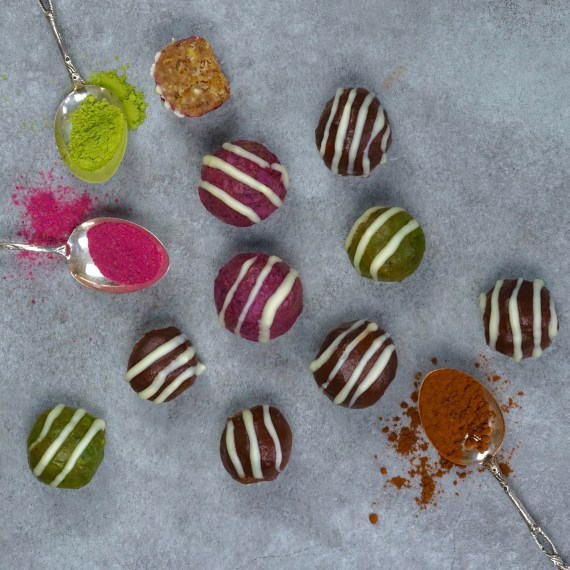 Hier wurden die Bällchen nach dem Grundrezept mit einem Esslöffel Kokosöl und einem kleinen Schuss Zitronensaft zubereitet, in jedes Bällchen wurde eine Kirsche eigearbeitet und die Bällchen anschließend in geschmolzene weiße Schokolade getaucht und direkt danach in Kokossplittern gerollt.Hier wurden die Bällchen nach dem Grundrezept zubereitet und anschliessend in geschmolzene weiße Schokolade getaucht und in Kokossplittern gerollt. Die Rot- und Blaufärbung entsteht durch Mischen der Kokossplitter mit Himbeerpulver bzw. Blauer Schmetterlingsblüte (Butterfly Pea Powder)Diese Bällchen wurden ebenfalls nach dem Grundrezept zubereitet, enthalten aber zusätzlich 1 Esslöffel Kokosöl und einen Schuss Limettensaft. Anschließend wurden sie in geschmolzene Kakaobutter getaucht, welche mit Matcha-Pulver grün, mit Kakaopulver braun und mit Drachenfrucht-Pulver violett gefärbt war, Hierfür könnte man auch Acai-Pulver oder andere Fruchtpulver verwenden.Für diese Superfood-Energiebällchen wurden zum Grundrezept noch 2 Esslöffel Kakaonibs, 1 Esslöffel Sesam, 1 Esslöffel Chiasamen sowie 2 Esslöffel gehackte Acaibeeren hinzugefügt.Diese Weihnachtsedition enthält zusätzlich zum Grundrezept 2 Teelöffel Zimt. Manche Bällchen wurden in Kokossplitter gerollt, manche in Himbeerpulver (pink), manche in Matcha-Pulver (grün), manche in Kurkuma (orange) und manche in gehackten Mandeln.Diese Energiebällchen wurden in Himbeerpulver von frooggies und Kokos gerollt.