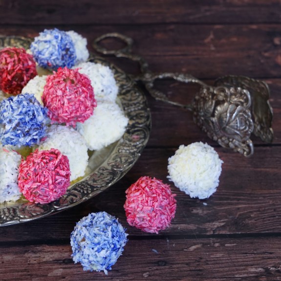 Die Bällchen werden einfach in den Handinnenflächen gerollt und können zum Schluss noch in Kokossplittern, Fruchtpulver, Mandelsplittern, Sesam, Kakao, geschmolzener Schokolade oder Ähnlichem gewälzt werden.