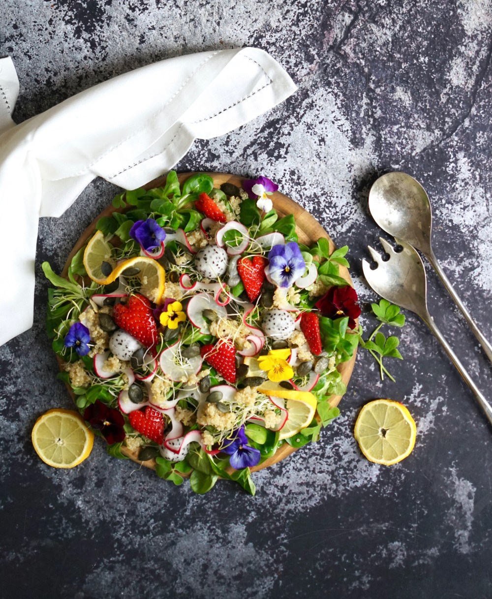 200g Feldsalat oder gemischter Salat 125 g Quinoa 250 ml Wasser ¼ Gurke 3-4 Radieschen 2 Hand voll Beeren (z.B. Erdbeeren und Blaubeeren) 1 Hand voll Sprossen 2 Esslöffel Kürbiskerne |