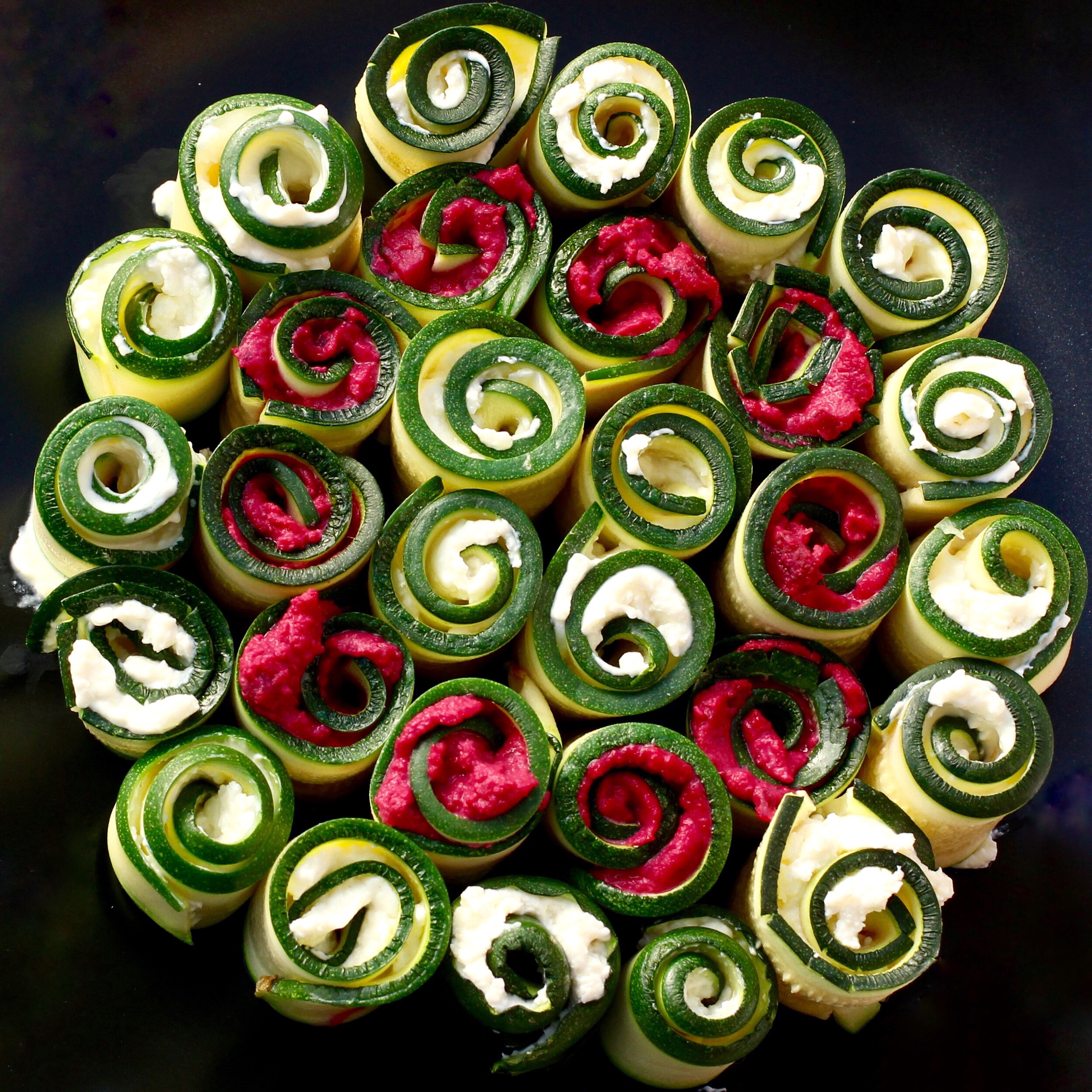 Bestreicht nun die Zucchinis mit Hummus oder der Creme und rollt sie ein. Ihr könnt auch Zahnstocher durchstechen, damit sie sie nicht wieder ausrollen, aber meistens hält es durch die Creme bzw. den Hummus schon ausreichend.