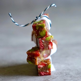 Mandeln und Datteln im Mixer zerkleinern und zu einem Teig kneten. Wenn es nicht klebrig genug ist, waren die Datteln vielleicht zu trocken. Gebt dann einfach mehr Datteln dazu. Wenn es sich zu klebrig anfühlt, gebt noch etwas Mandelmehl hinzu. Knetet nun auch die Pistazien und die Getrockneten Erdbeeren ein, rollt den Teig auf einem Backpapier ca. 2 cm dick aus (es bietet sich an, dazu ein zweites Backpapier oben drauf zu legen, dann bleibt nichts an der Rolle kleben). Schneidet nun die Riegel mit einem großen Messer aus und legt sie für mindestens 2 Stunden in den Kühlschrank zum Nachhärten. In einer geschlossenen Box halten sie sich 2 Wochen lang.